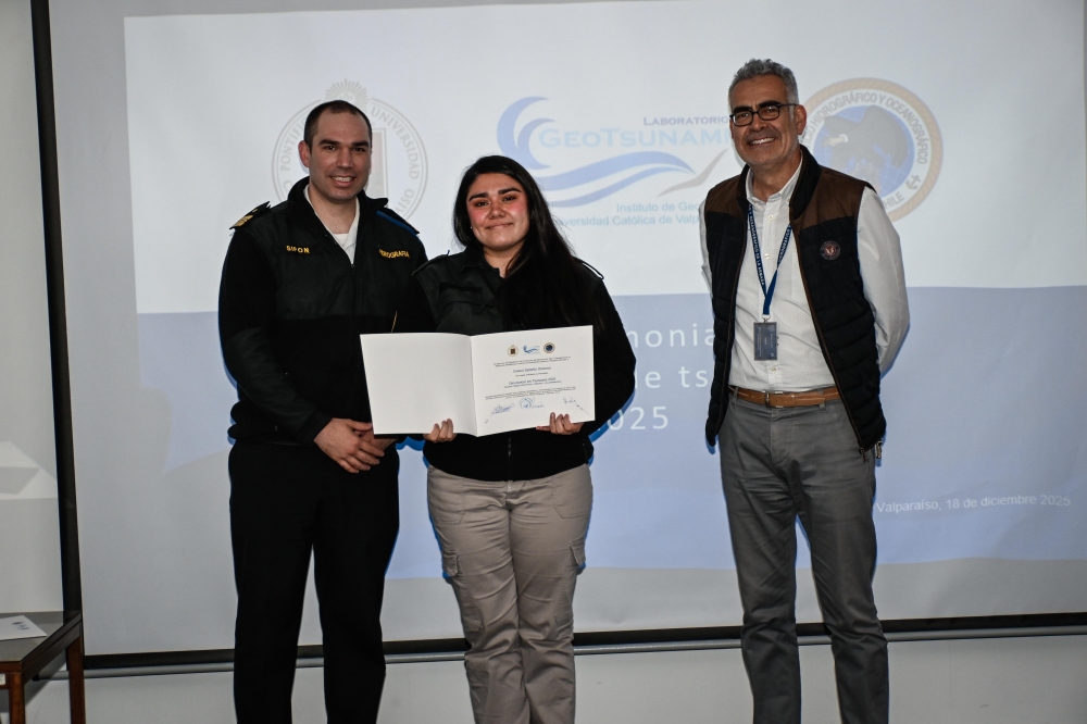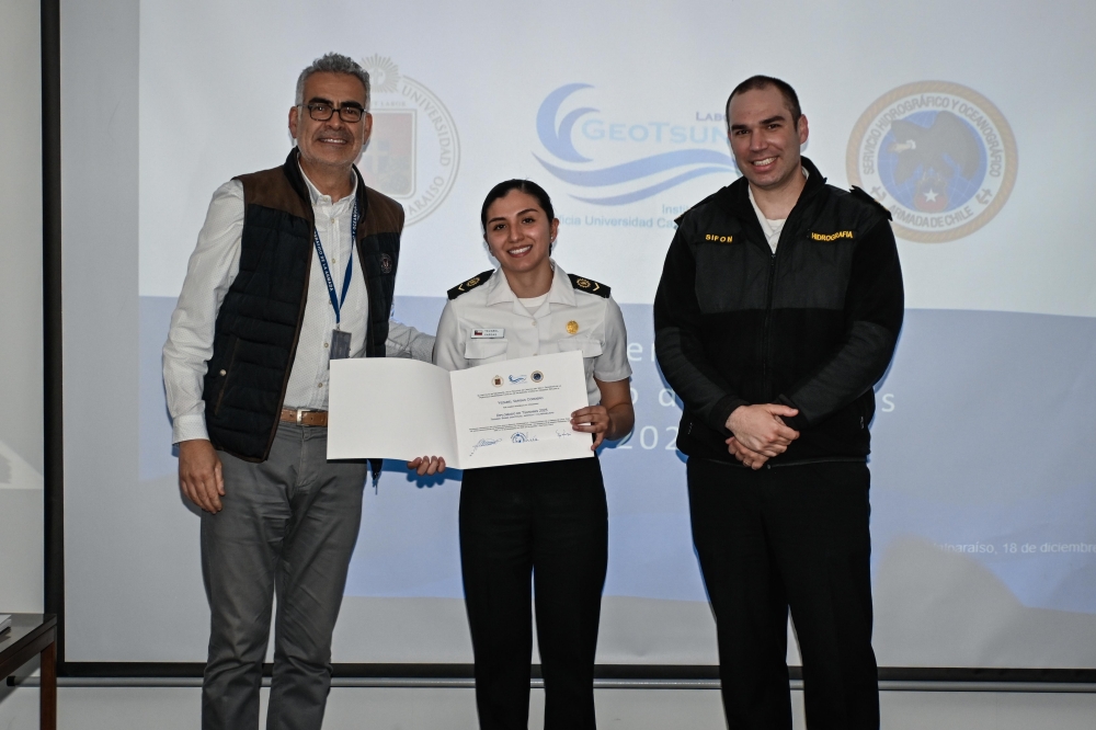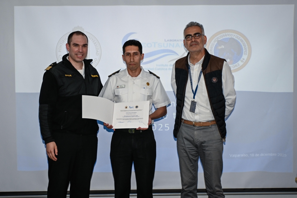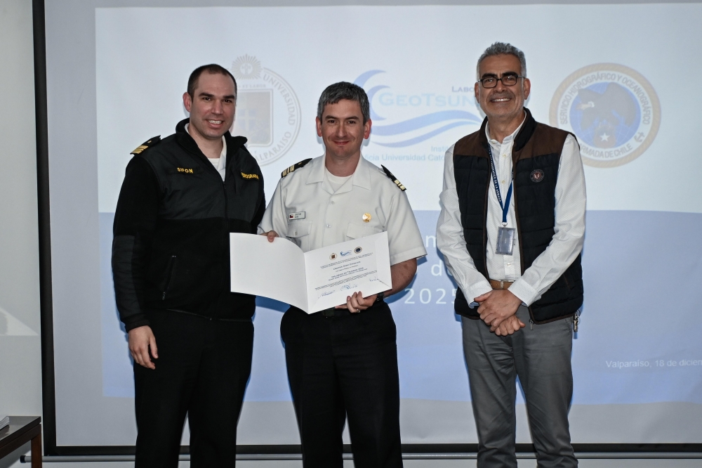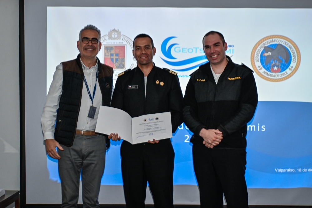 En dependencias del Servicio Hidrográfico y Oceanográfico de la Armada (SHOA) se desarrolló la ceremonia de entrega de diplomas del Diplomado en Tsunamis de la Universidad Católica de Valparaíso, presidida por el Subdirector del SHOA Capitán de Fragata Rodrigo Quezada y el Dr. Marco Cisternas, académico de la Universidad de Valparaíso y profesor a cargo del diplomado, el día jueves 18 de diciembre.
