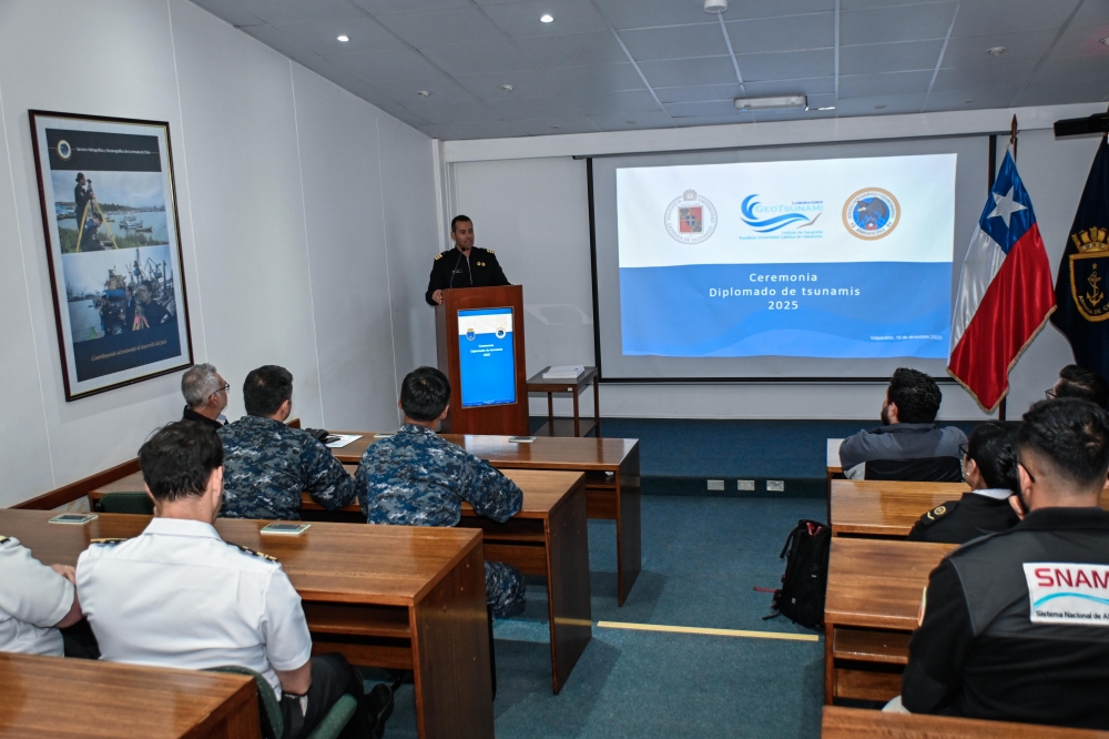 “Para el SHOA, y en particular para el Sistema Nacional de Alarma de Maremotos (SNAM), el diplomado reviste una importancia estratégica. La formación avanzada del personal que participa en la evaluación y monitoreo de tsunamis contribuye directamente al fortalecimiento del análisis técnico, la toma de decisiones oportunas y la mejora continua de los procesos asociados a la alerta temprana, en beneficio de la seguridad de la población y del ámbito marítimo. En este contexto, la articulación entre la academia y las instituciones del Estado resulta fundamental, para el desarrollo y consolidación de las capacidades nacionales en esta materia”, declaró el Oficial.