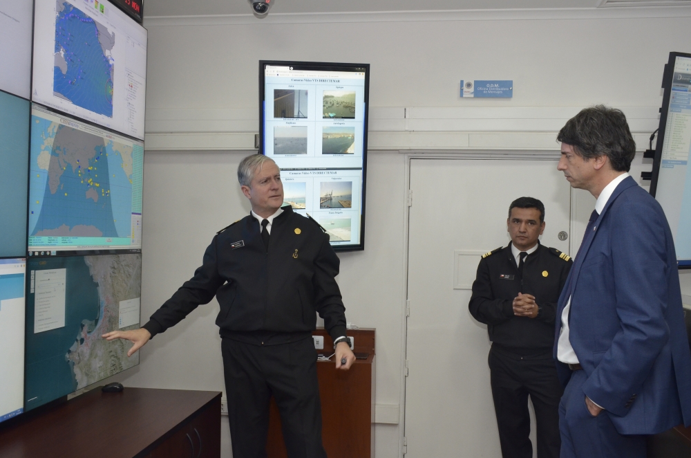 Posteriormente, las autoridades realizaron un recorrido por las instalaciones del Depto. de Hidrografía, donde se realizan procesamientos y edición cartográfica; el Depto. de Oceanografía, donde se monitorea la Temperatura Superficial del Mar (TSM) y la Sala de Operaciones del Sistema Nacional de Alarma de Maremotos (SNAM), donde se les expuso sobre los protocolos y procedimientos de operación del Sistema.
