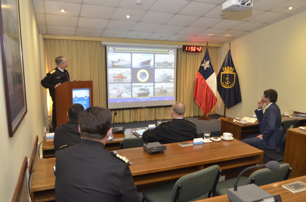Se dio inicio a la visita con una detallada exposición sobre la Hidrografía, Cartografía y Oceanografía, entre otras disciplinas en las cuales el Servicio es el Organismo Técnico, Oficial y Permanente del Estado, realizando especial hincapié en la contribución a la investigación científico-marina, principalmente a través de los Cruceros de Investigación Marina en Áreas Remotas (CIMAR), organizados desde sus inicios en el año 1995, ya sea en históricas plataformas como el Agor “Vidal Gormaz” o el “Abate Molina” hasta el actual Buque Oceanográfico “Cabo de Hornos”; organizados por el Comité Oceanográfico Nacional (CONA), bajo la dependencia del SHOA.